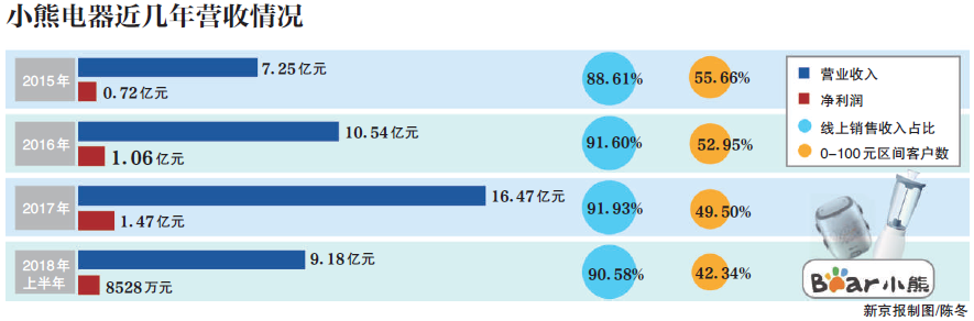 不过,根据招股书,小熊电器2018年上半年营收9.18亿元,而线上销售所带来的营收成为主要部分,高达8.3亿元,占比超过90%。从招股书看,小熊电器盈利增长明显,但在靓丽的财报背后,亦存隐忧——销售渠道单一、客单价低、研发费用少、广告费用高等。