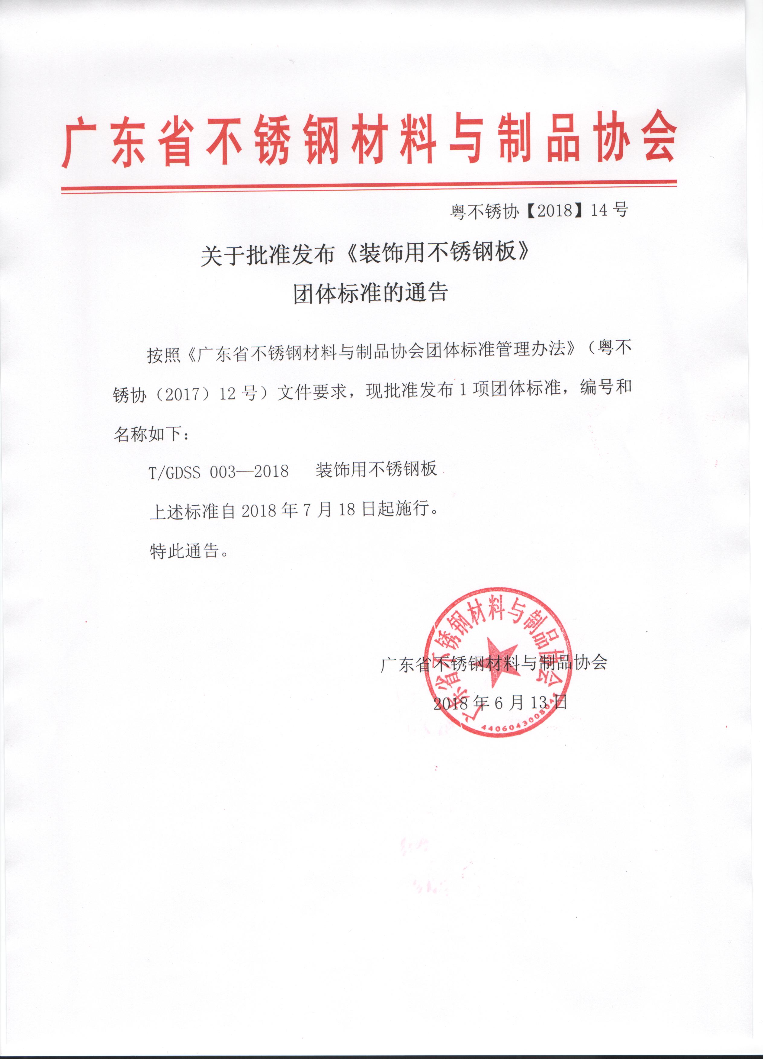 关于批准发布《装饰用不锈钢板》团体标准的通告