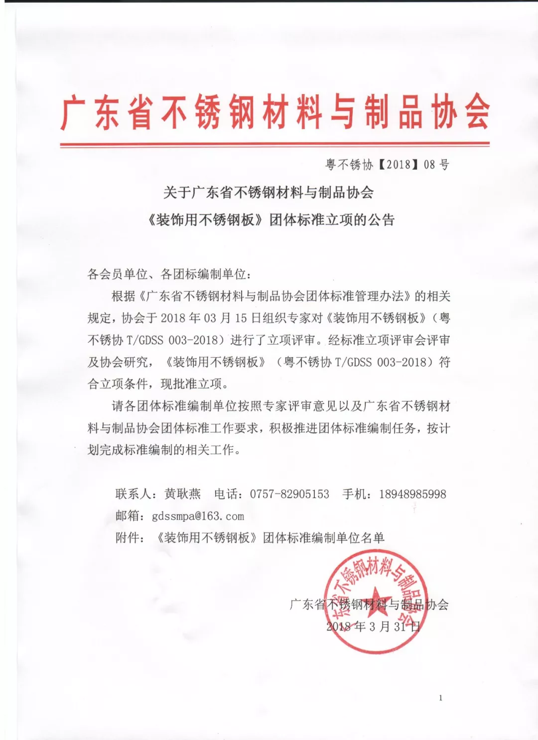 根据《广东省不锈钢材料与制品协会团体标准管理办法》的相关规定,协会于2018年03月15日组织专家对《装饰用不锈钢板》(粤不锈协T/GDSS 003-2018)进行了立项评审。经标准立项评审会评审及协会研究,《装饰用不锈钢板》(粤不锈协T/GDSS 003-2018)符合立项条件,现批准立项。