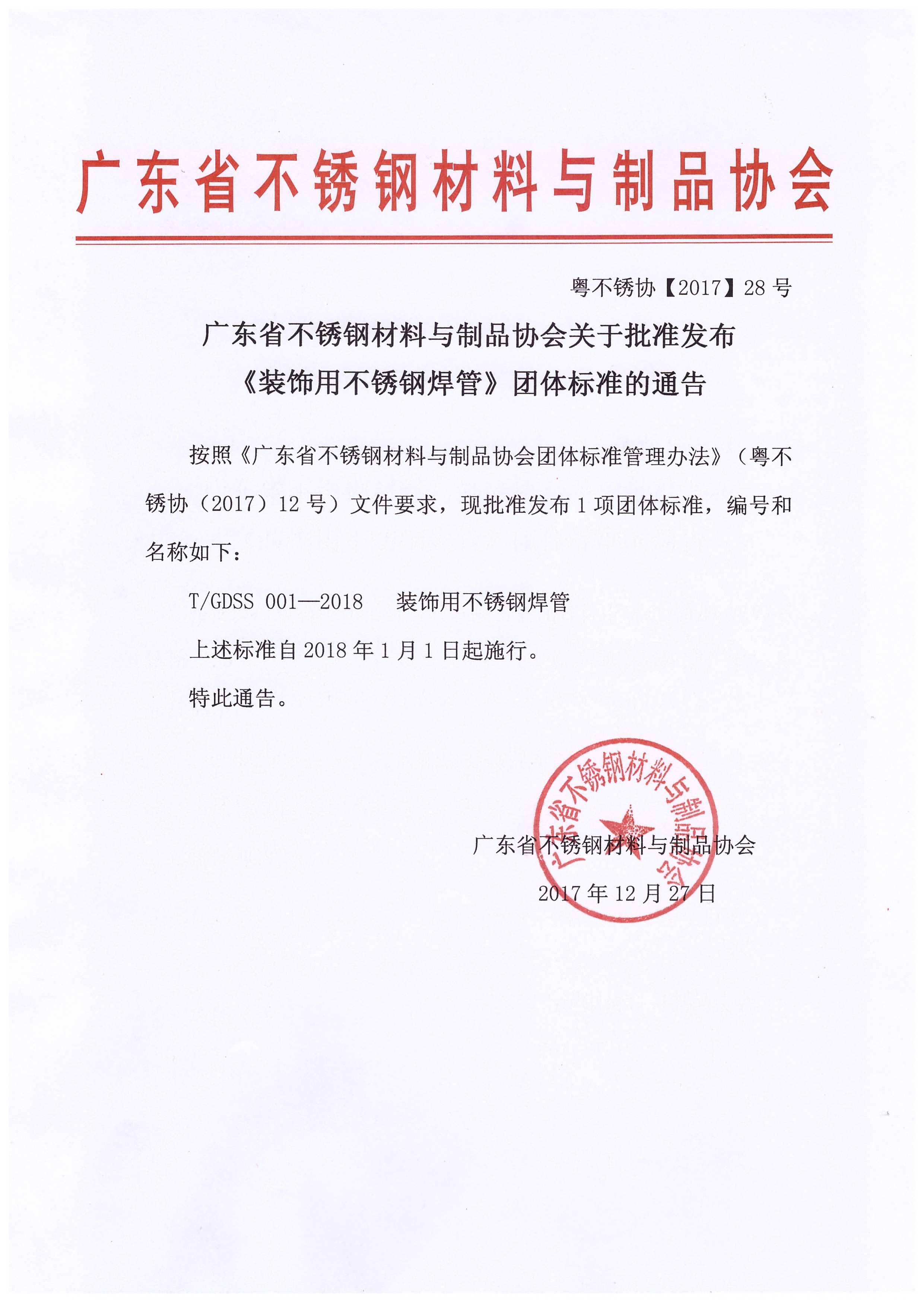 广东省不锈钢材料与制品协会关于批准发布《装饰用不锈钢焊管》团体标准的通告