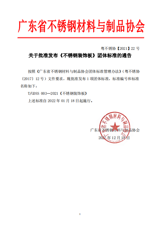 按照《广东省不锈钢材料与制品协会团体标准管理办法》(粤不锈协(2021)22号)文件要求,现批准发布1项团体标准,标准编号和标准名称如下: T/GDSS 003—2021 《不锈钢装饰板》