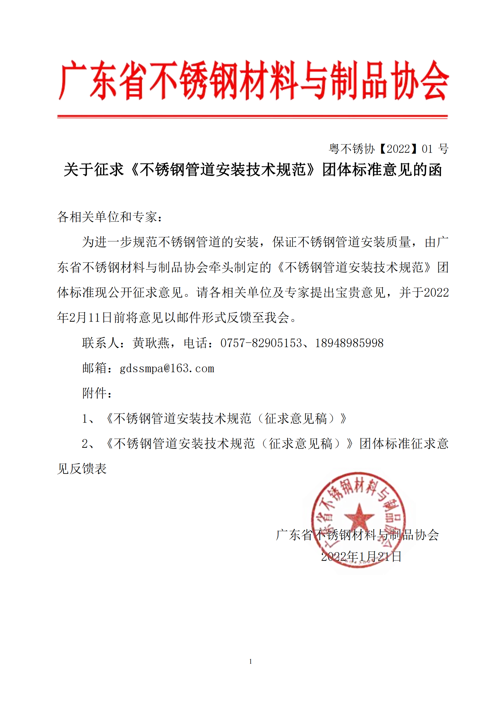 广东省不锈钢材料与制品协会关于征求《不锈钢管道安装技术规范》团体标准意见的函