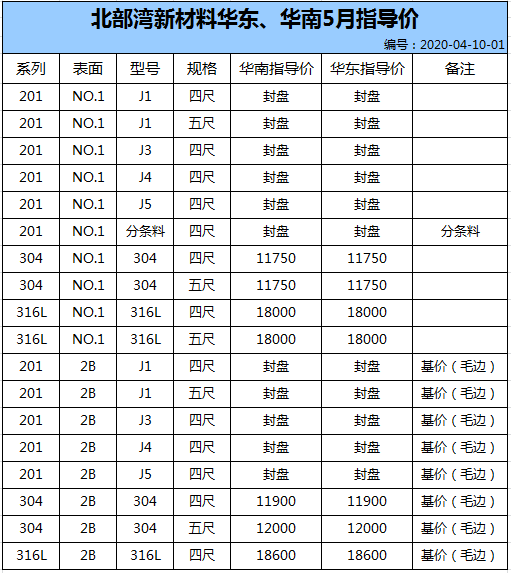 据北部湾新材料消息,今日早间,其发布了5月指导价。据悉,其200系全面封盘,具体如下: