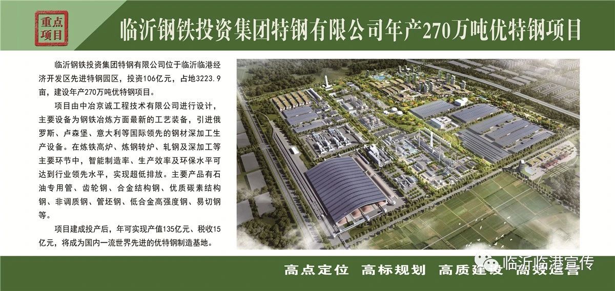 临沂钢铁投资集团特钢有限公司位于临沂临港经济开发区先进特钢园区,投资106亿元,占地3223.9亩,建设年产270万吨优特钢项目。