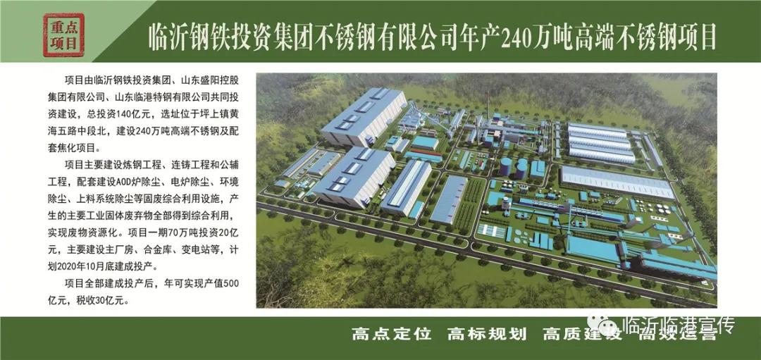 项目由临沂钢铁投资集团、山东盛阳控股集团有限公司、山东临港特钢有限公司共同投资建设,总投资140亿元,选址位于坪上镇黄海五路中段北,建设240万吨高端不锈钢及配套焦化项目。