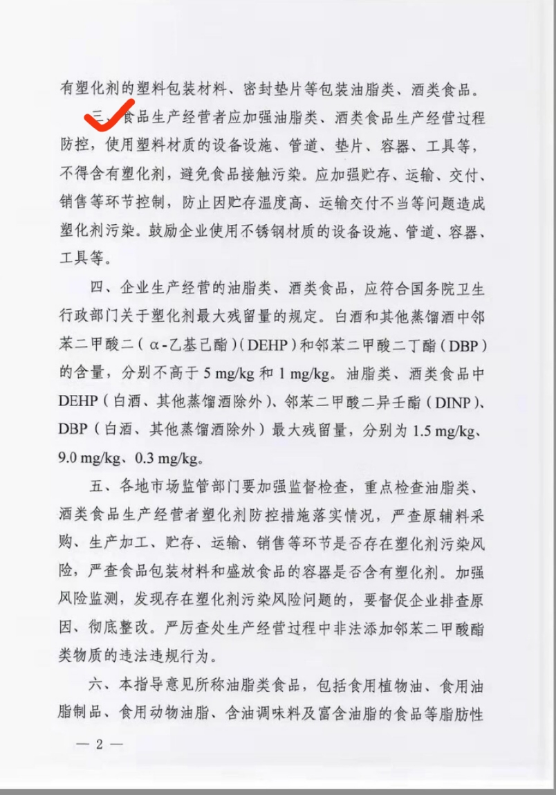 该意见第三条明确指出,食品生产经营者应加强油脂类、酒类食品生产经营过程防控,使用塑料材质的设备设施、管道、垫片、容器、工具等,不得含有塑化剂,避免食品接触污染。应加强贮存、运输、交付、销售等环节控制,防止因贮存温度高、运输交付不当等问题造成塑化剂污染。鼓励企业使用不锈钢材质的设备设施、管道、容器、工具等。