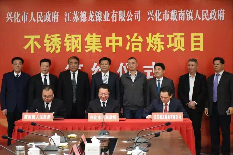 据江苏兴化市戴南镇消息,4月28日上午,兴化市举行不锈钢集中冶炼项目签约仪式。兴化市政府、江苏德龙镍业有限公司和戴南镇政府三方签约。