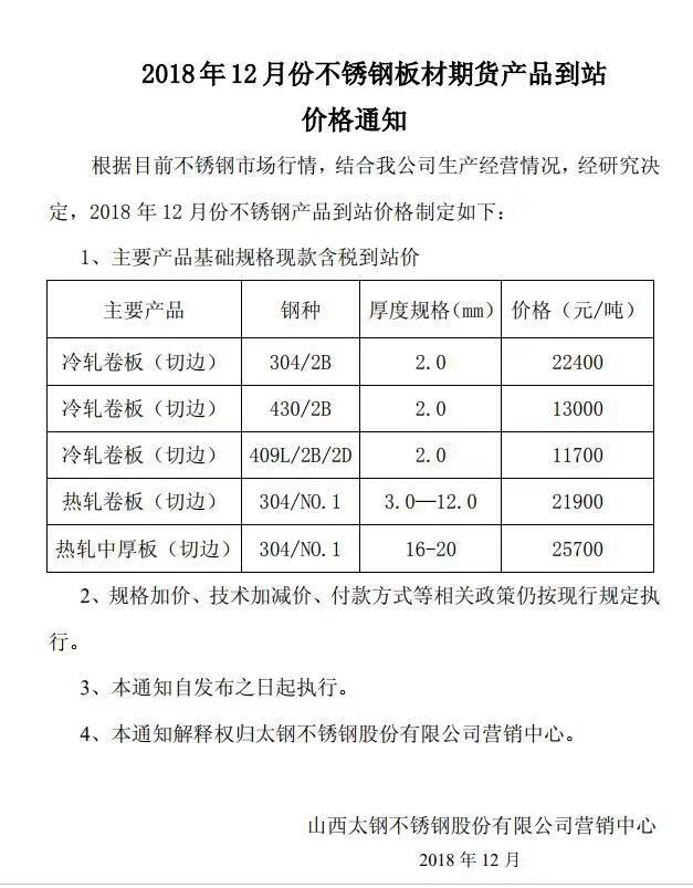 太钢不锈公布12月不锈钢板材期货最新价格