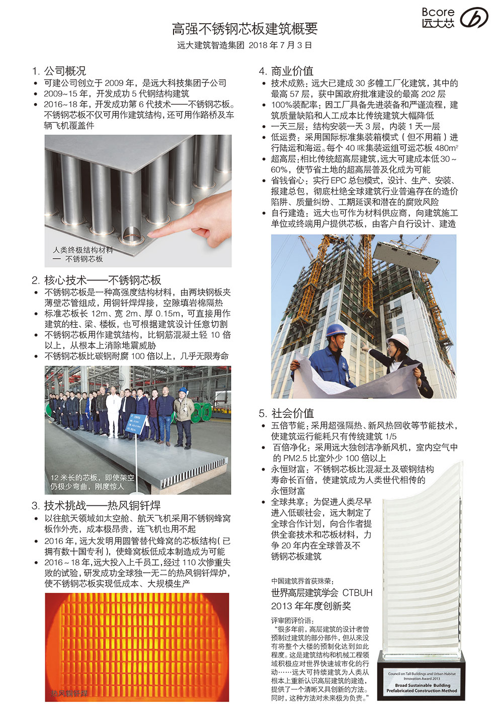 全球首座不锈钢芯板建筑落户长沙远大城,12米的4层建筑,只用20块标准芯板、4天时间就完成结构安装和内装。具有隔热隔音、耐腐、抗震等功能,运行能耗只有传统建筑的五分之一。