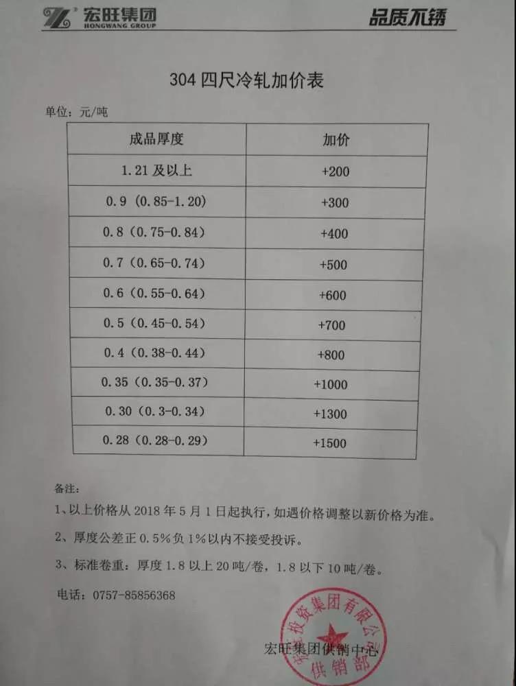 继诚德、甬金调整加价后,据悉,宏旺也再度调整304四尺冷轧加价,5月1日起执行。