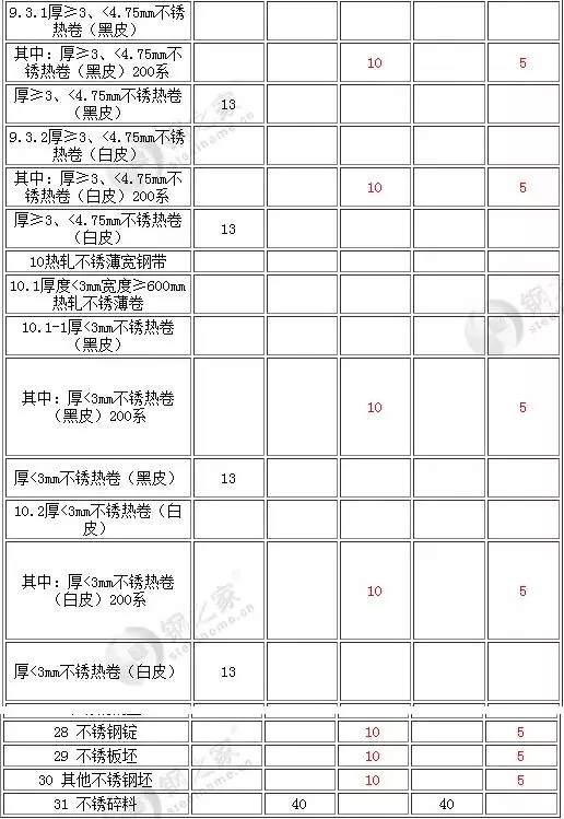 2017年12月15日,国务院关税税则委员会发布《2018年关税调整方案》,取消棒材、螺纹钢和线材的出口暂定关税,降低200系热轧不锈钢卷、钢锭、钢坯及部分铁合金等产品出口暂定关税。其中200系热轧不锈钢卷、不锈钢锭、合金钢锭、不锈钢坯、合金钢坯出口暂定关税由10%下调到5%;普钢锭、普钢坯出口暂定关税由15%下调到10%;高碳钢坯根据不同用途下调至5%和10%,其中车轮用连铸圆坯(直径为380MM和450MM,公差±1.2%,含碳量:0.38%-0.85%,含锰量:0.68%-1.2%,含磷量≤0.012%,总氧化物含量≤0.0012%)由15%下调至5%,其他高碳钢坯由15%下调至10%。硅铬铁、钛铁及硅钛铁、其他钒铁、铌铁及直接还原铁及其他海棉铁块团出口暂定关税由15%下调至10%。调整后我国不锈钢产品出口税率、出口暂定税率和出口退税率执行情况见下表。