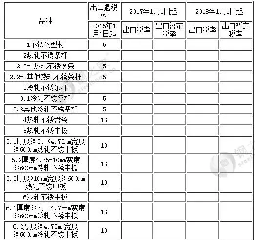 2018年我国不锈钢出口退税税率和出口暂定关税一览