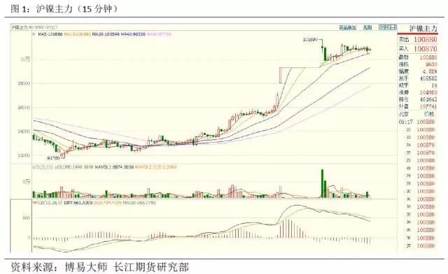 10 月31 日夜间尾盘15 分钟急涨约1000 元/吨,最高达到97190 元/吨。11 月1 日开盘后跳空高开,一分钟内急拉2320元/吨打到涨停板99340 元/吨随即封死。夜盘开盘后5 分钟内拉高至101690 元/吨,创2015年6 月以来新高,随后稍显转弱象,目前以高位震荡为主。