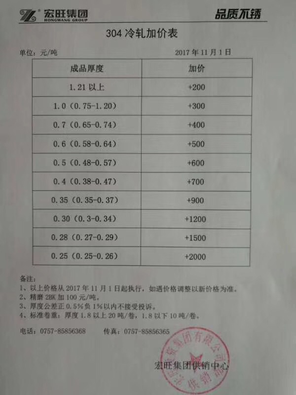 据宏旺消息,其已出台最新304冷轧加价表,具体如下: