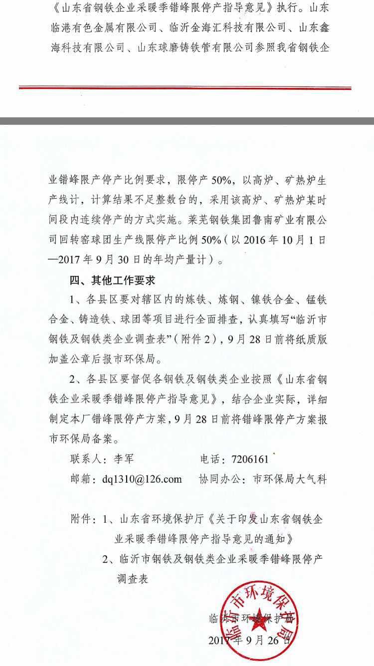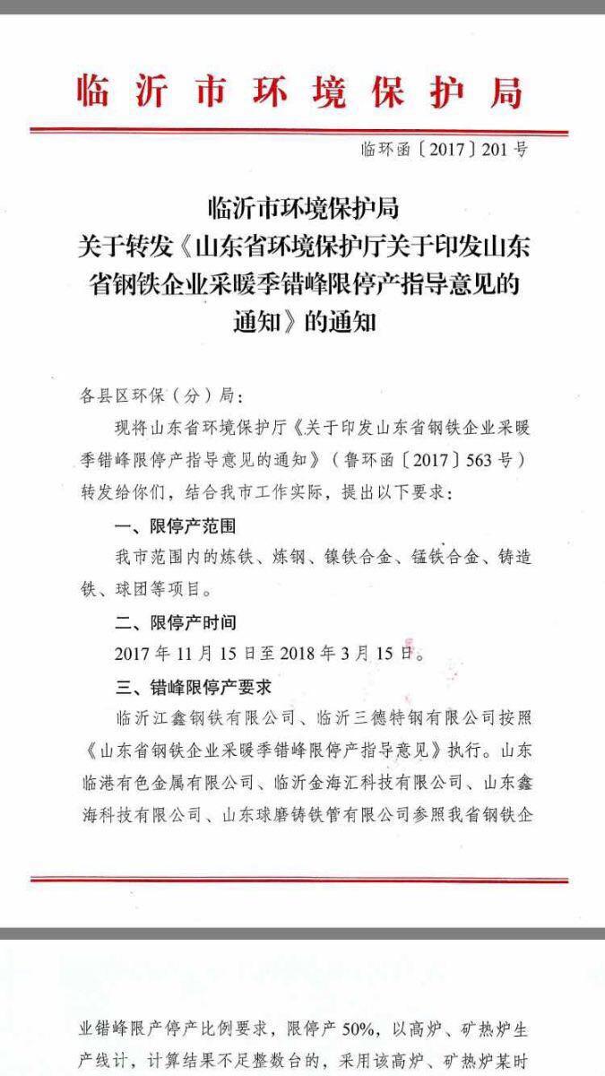 据山东临沂市环保局消息,节前,山东省环保厅发出《关于印发山东省钢铁企业采暖季错峰限停指导意见的通知》。临沂市环保局在随后转发了该通知并提出要求。通知要求在临沂市的炼铁、炼钢、镍铁合金、锰铁合金、铸造铁、球团等项目,将在2017年11月15日至2018年3月15日期间采取限停产措施。据悉,部分镍铁企业将会在此期间限停产50%;而涉及的镍铁企业包括临港有色金属有限公司、临沂金海汇科技有限公司、山东鑫海科技有限公司等3家企业。