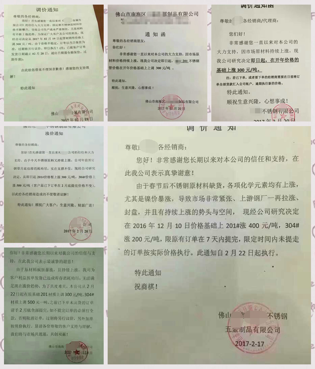 处于“夹心层”的制管厂也按耐不住,很多管厂已纷纷发出调价通知。总体来看,201上调200-400元/吨,304上调200-500元/吨。