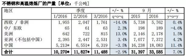 据布鲁塞尔2016年12月20日消息—国际不锈钢论坛(ISSF)发布的数据表明,2016年前9个月全球不锈钢粗钢产量同比增长7%,达到3360万吨。除了中东欧之外,其他地区产量都有所增长。