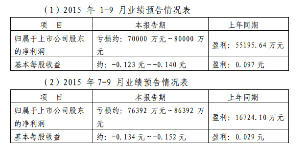 太钢不锈:2015年前三季度业绩预告