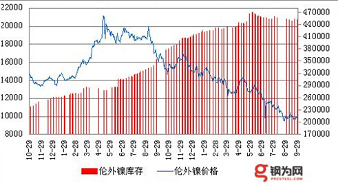 据钢为网数据统计,9月份,伦镍最高价报10055美元/吨,最低价报9650美元/吨,高低价差为405美元/吨。截至9月30日,LME电镍收9880涨85,库存减786为451500,电铜收4982涨14,沪镍1601收75540跌1980。