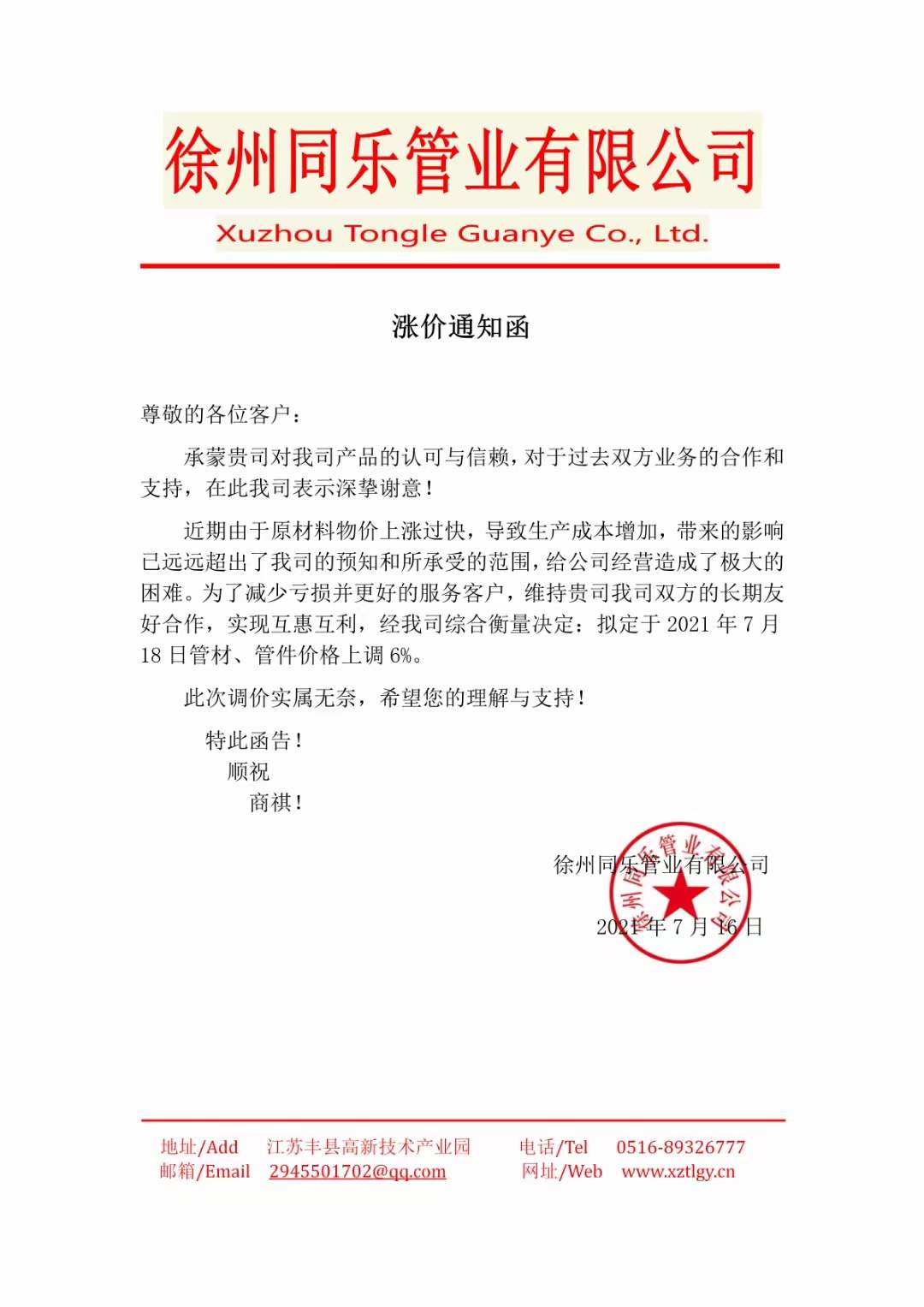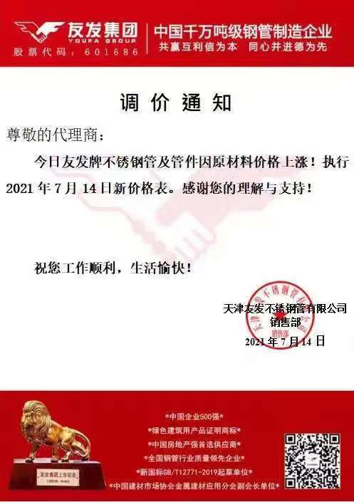 广东省不锈钢材料与制品协会留意到,天津、福建、浙江、江苏等地多家不锈钢水管企业近日已纷纷发出涨价通知。
