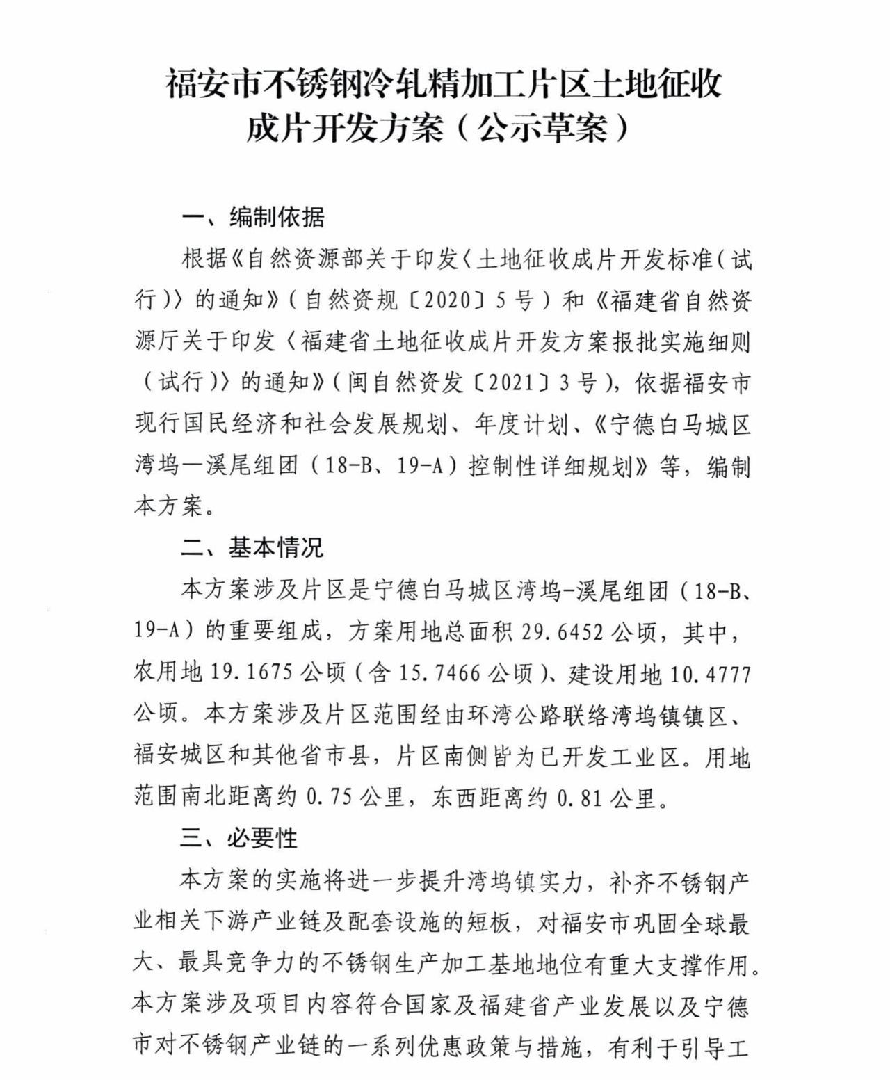 福建福安市不锈钢冷轧精加工片区成片开发方案公示