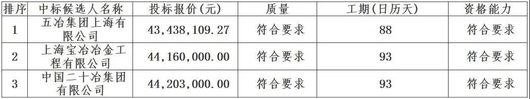 日前,宝华智慧招标共享平台发布宝钢德盛不锈钢高炉超低排放技术改造(一步)项目] 中标候选人公示。公告显示,五冶集团上海有限公司是中标候选人第一位。详情如下: