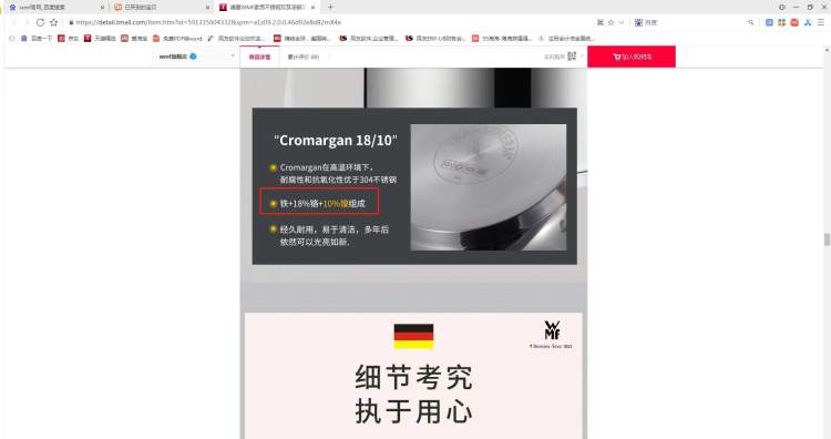 目前,WMF注册钢材商标Cromargan 18/10不锈钢承诺含10%镍含量的内容,现在官网和天猫店铺都已经删除了这个描述。
