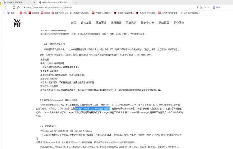 但是百度百科中搜索“WMF”这个词,仍然可以看到他们对Cromargan 18/10不锈钢含10%镍的内容,其中有百度快照记录了他们官网的展示内容。
