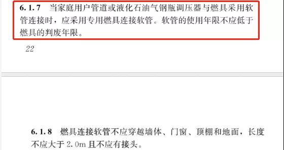 细心阅读会发现其中第6.1.7条款对于燃气连接软管的要求出现了很大的新变化:“当家庭用户管道或液化石油气钢瓶调压器与燃具采用软管连接时,应采用专用燃具连接软管。软管的使用年限不应低于燃具的判废年限”。根据《家用燃气燃烧器具安全管理规则》GB17908规定,燃具的判废年限:天然气热水器判废年限应为8年;燃具灶具的判废年限应为8年;如生产企业有明示的燃具和配件的判废年限,应以企业明示为准,但不能低于以上规定。由此,可以结合新规范“软管的使用年限不应低于燃具的判废年限”要求,软管的使用寿命必须在8年以上。故而,橡胶燃气连接软管是无法满足这一条件的,必属淘汰之列。