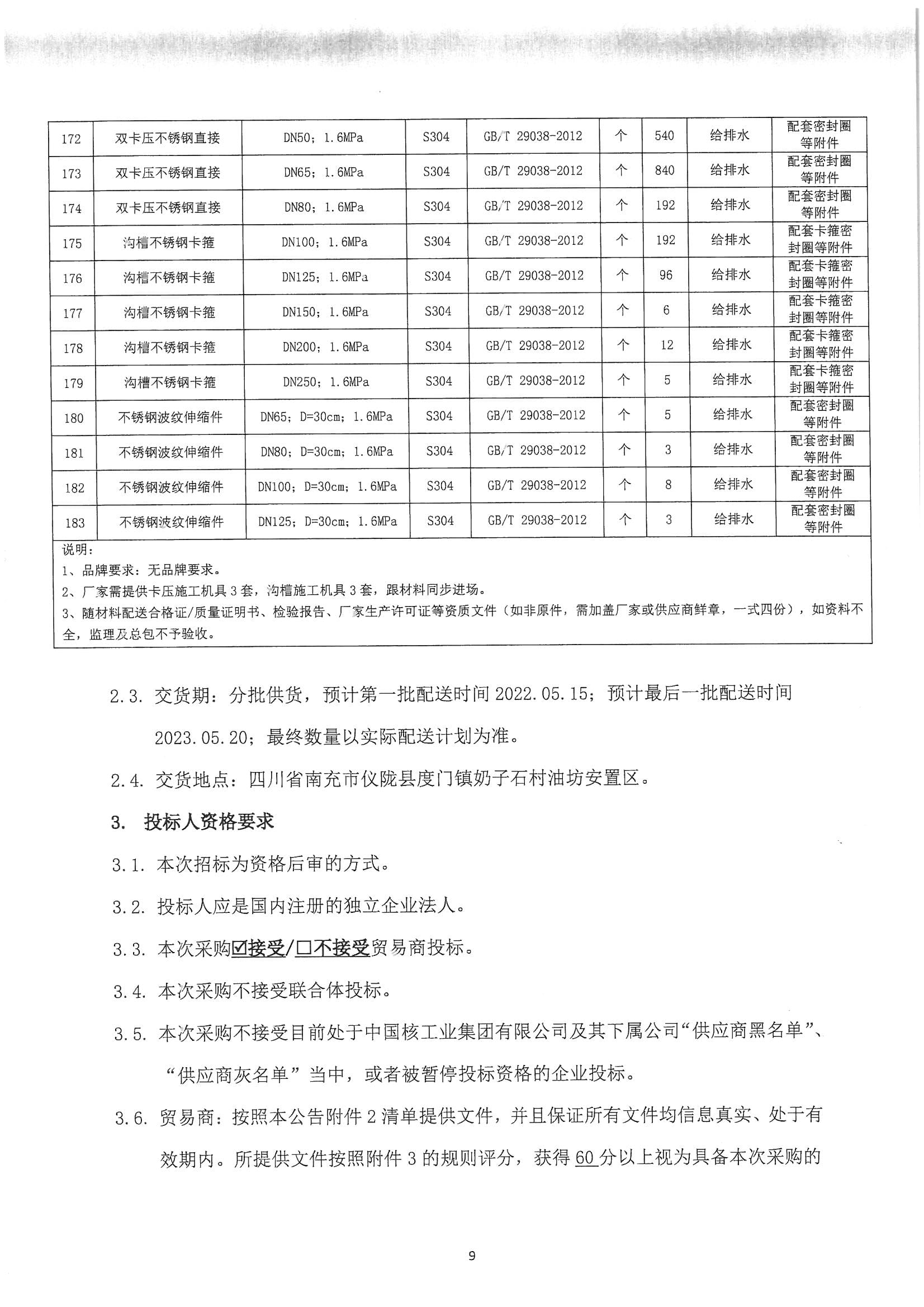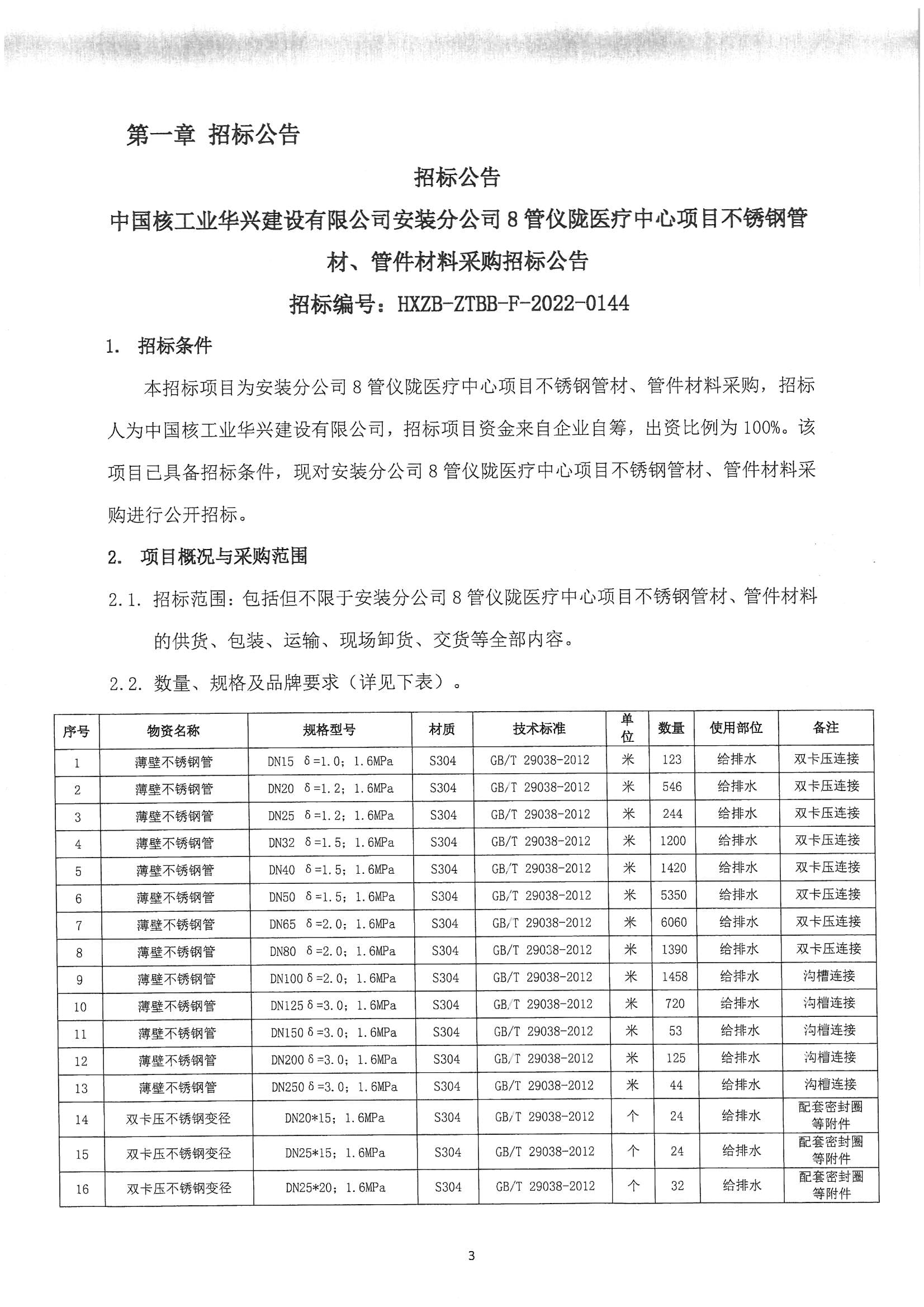 仪陇医疗中心项目不锈钢管材及管件采购招标公告