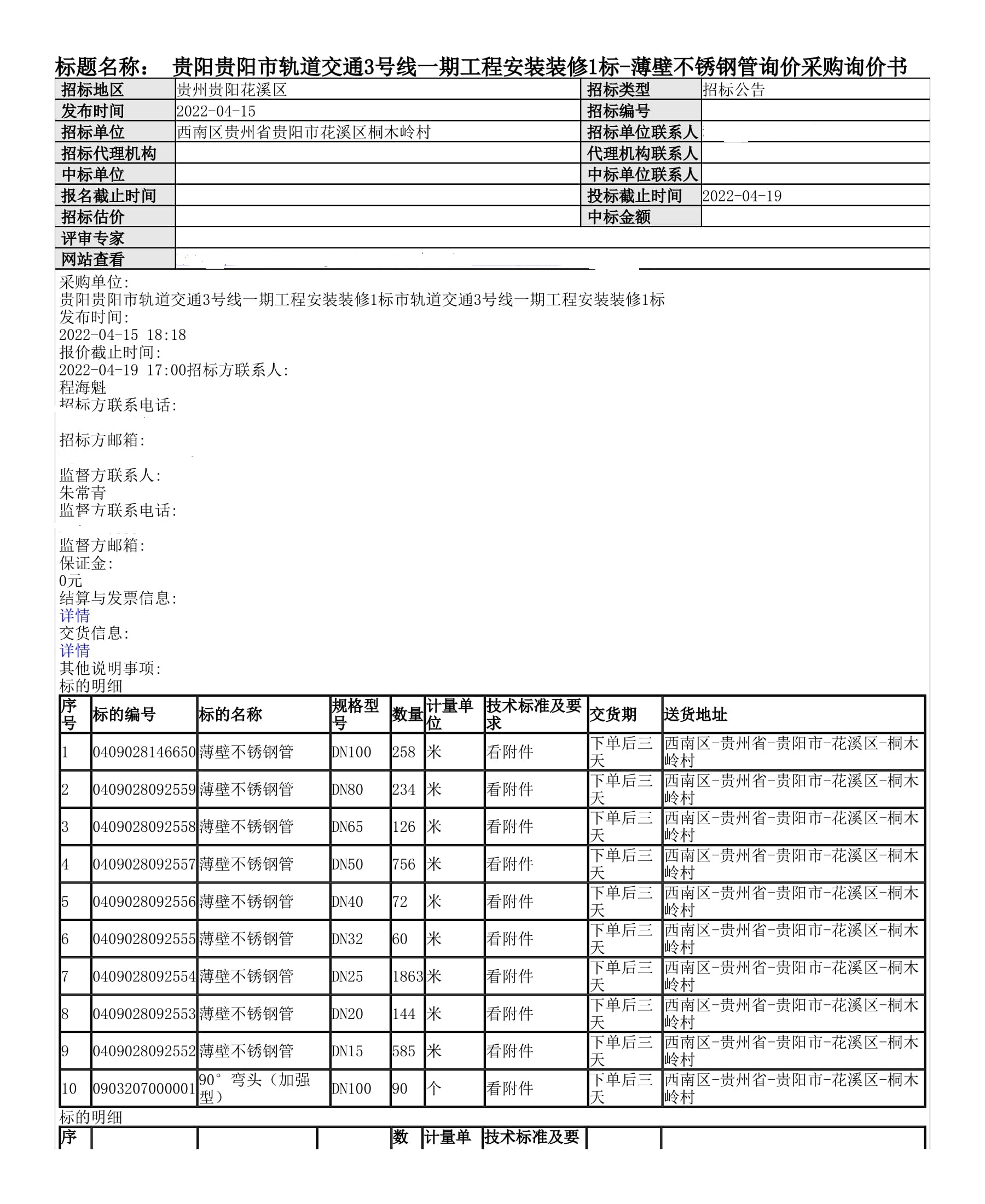 贵阳市轨道交通3号线一期工程薄壁不锈钢管采购询价书