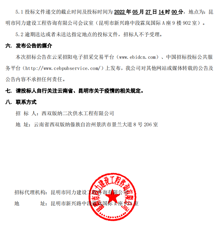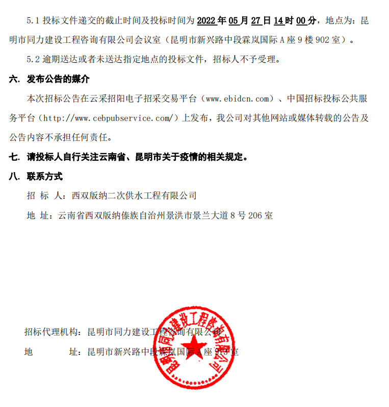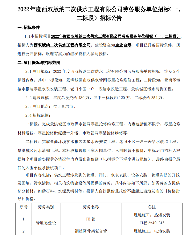 2022年度西双版纳二次供水工程公司招标公告