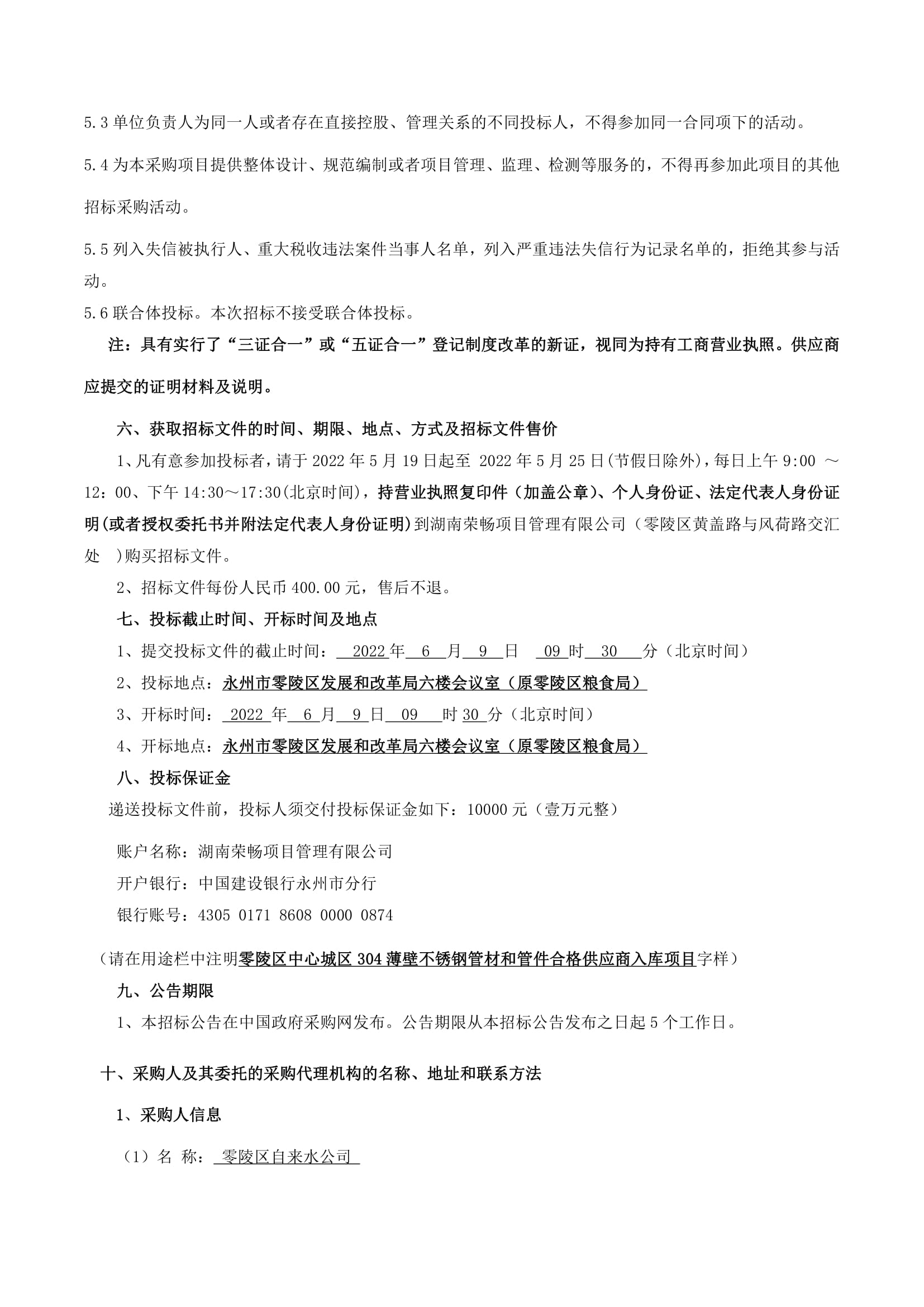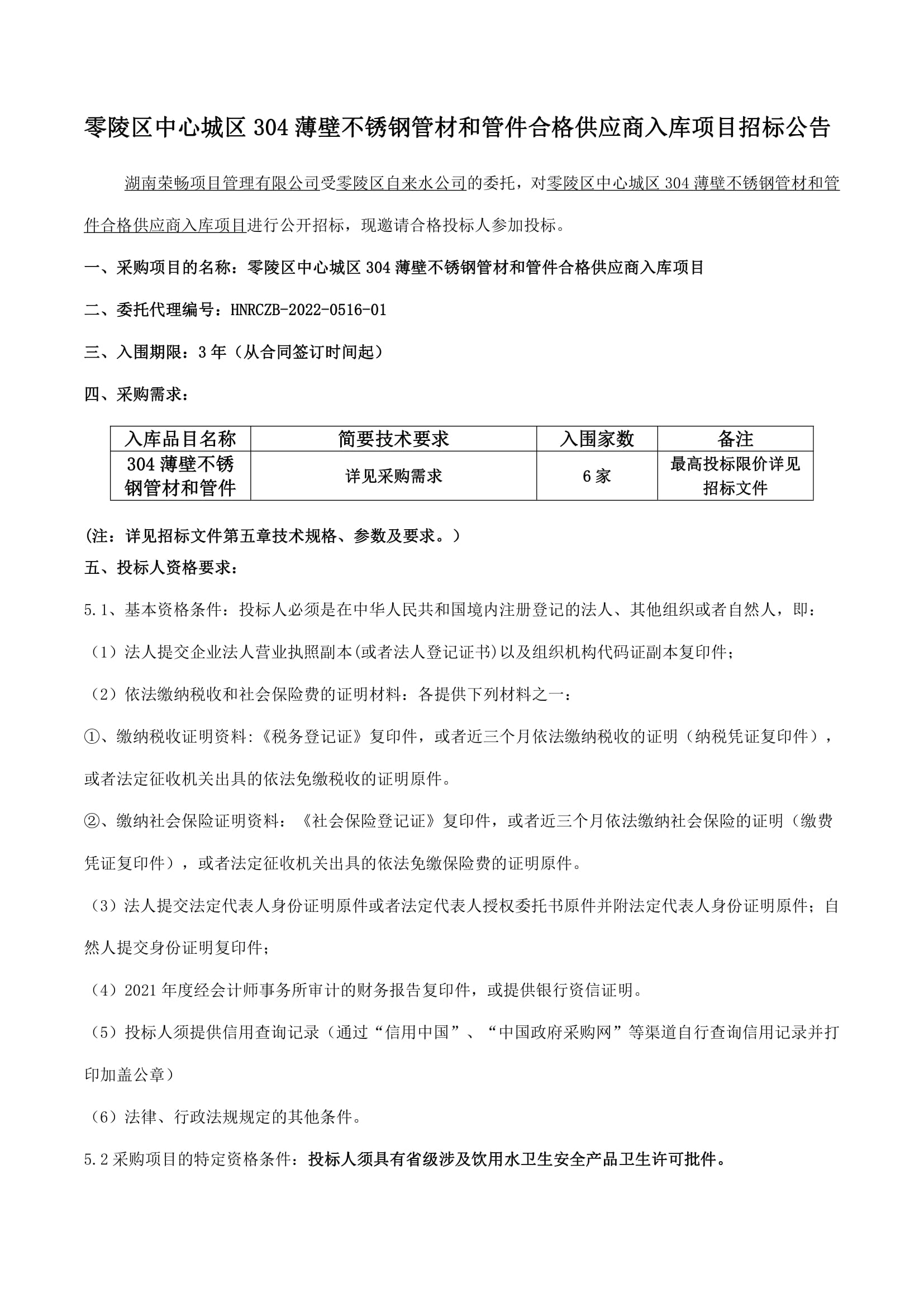零陵区不锈钢管材管件合格供应商入库项目招标公告