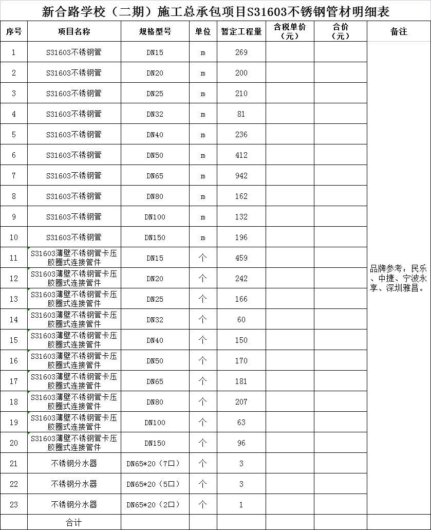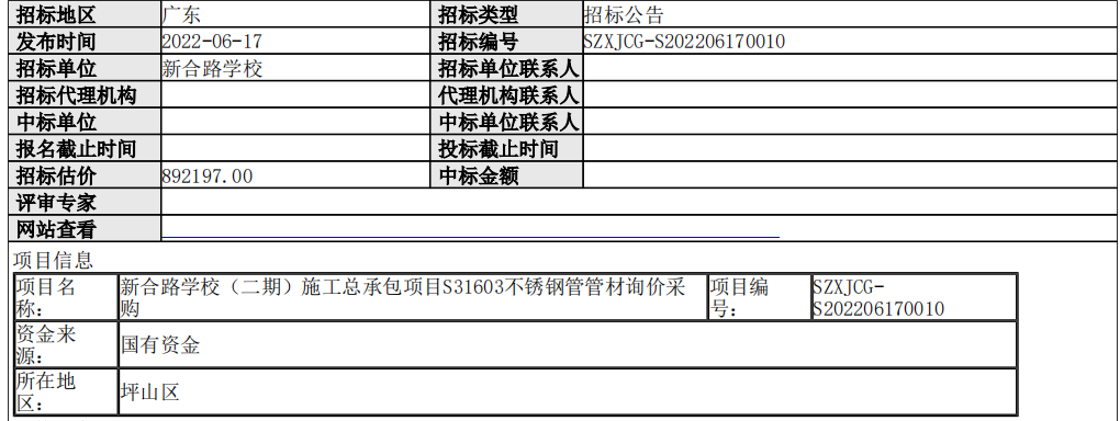 深圳新合路学校(二期)316不锈钢管材采购公告