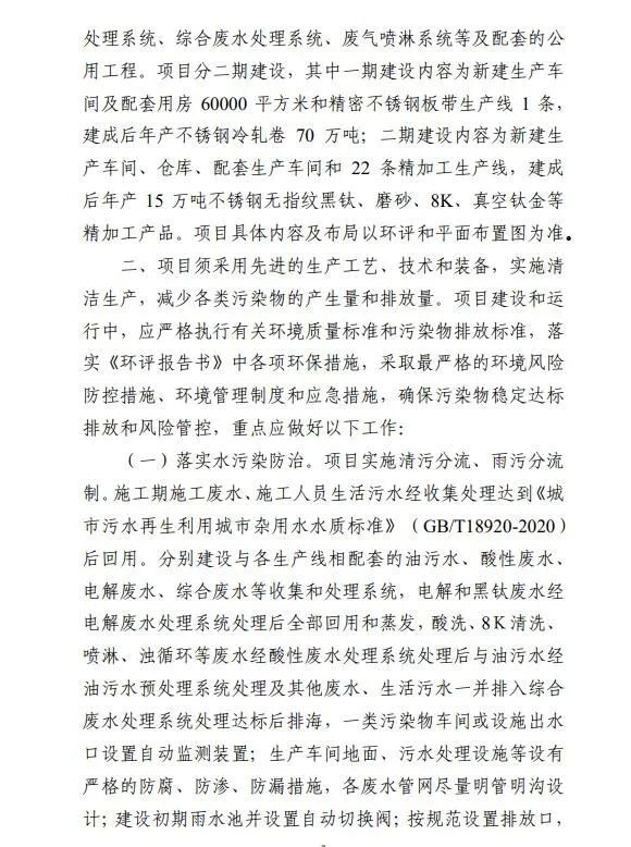 青山年产70万吨不锈钢及配套精加工项目环评批复