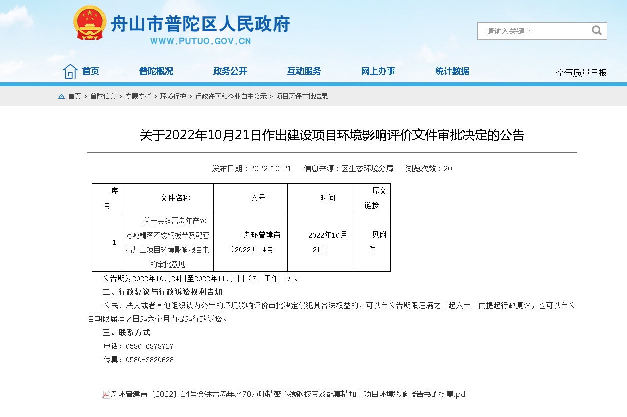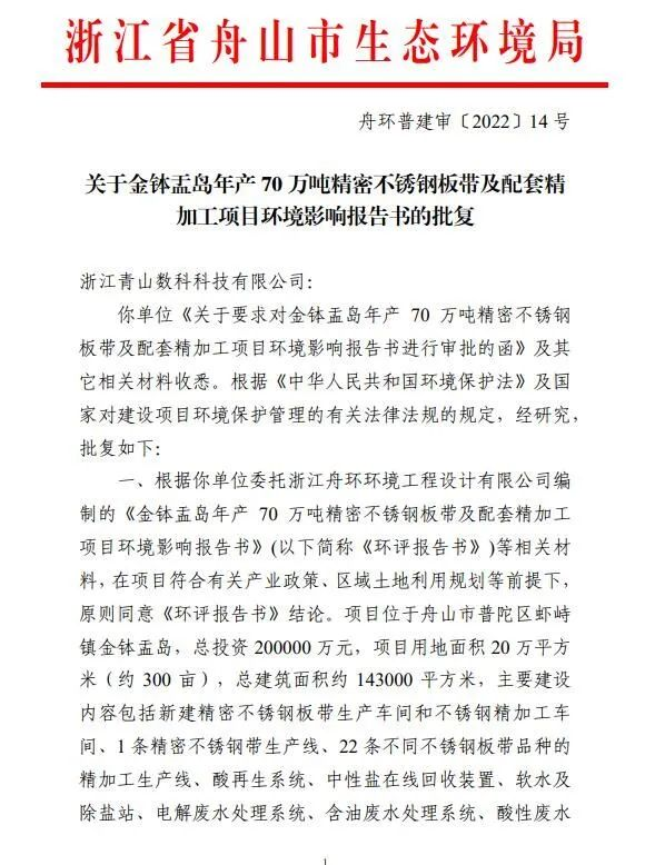 据浙江舟山市普陀区人民镇府消息, 青山年产70万吨不锈钢及配套精加工项目环评已批复,具体如下: