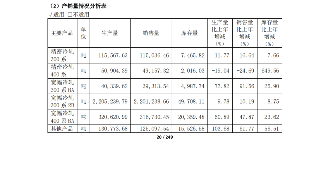 报告显示,全年生产入库冷轧不锈钢 283.56 万吨,同经增长 15.14%,销量 281.98 万吨,同比增长14.42%,实现营业收入 3,987,381.70 万元,同比增加 0.81%,归母净利润 45,301.17 万元,同比减少6.94%;公司资产总额 1,258,273.56 万元,同比增加 19.25%;归母净资产 519,594.74 万元,同比增加 29.25%,在行业低谷期仍然保持了稳健经营。