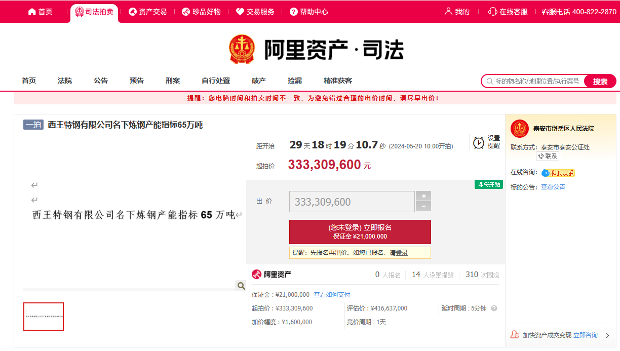 据阿里拍卖消息,西王特钢有限公司名下炼钢产能指标65万吨将在2024年5月20日上午10时开始拍卖,起拍价为333,309,600元。