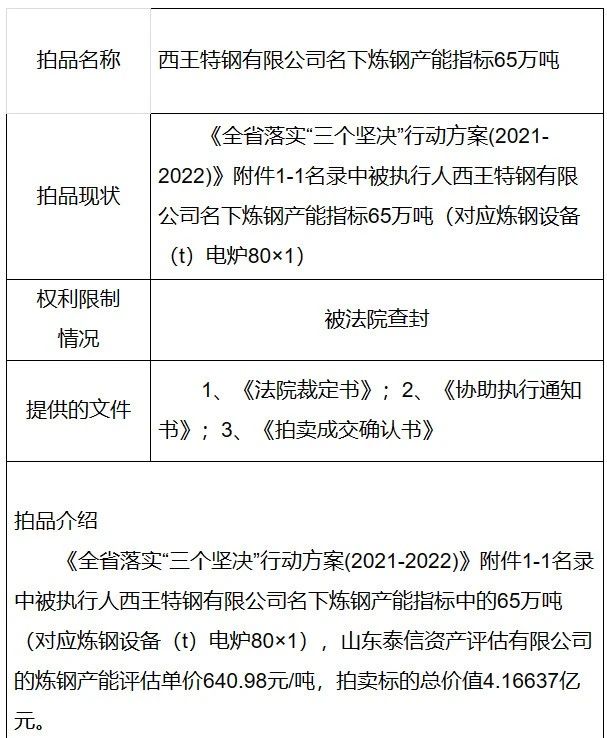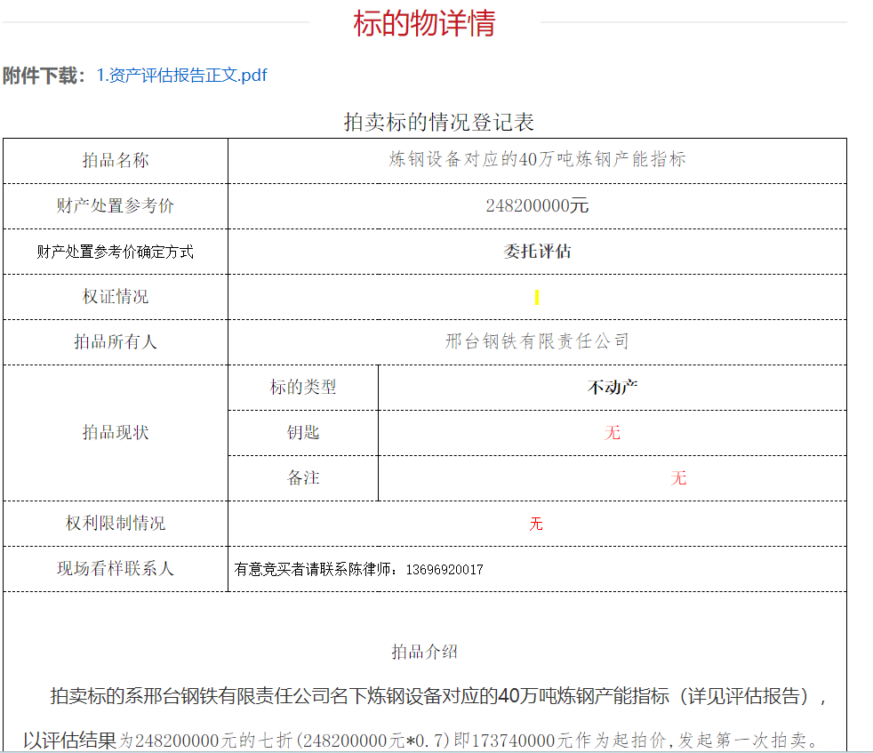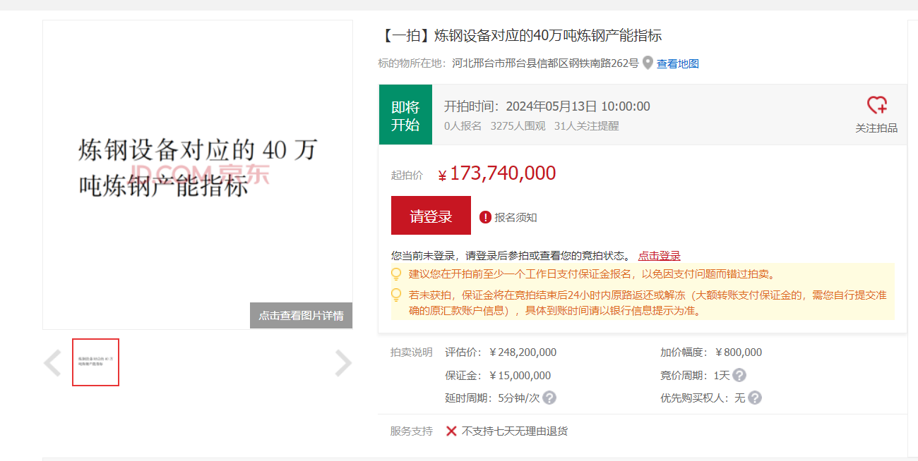 另据京东拍卖消息,邢台钢铁有限责任公司名下40万吨炼钢产能指标将于5月13号开拍: