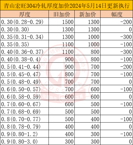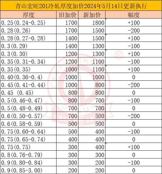 据市场消息,昨日,4月底已公布的青山宏旺新加价政策正式通知执行:即日起宏旺201、304冷轧对外新签订合同按新规格加价表执行。具体规格加价如下: