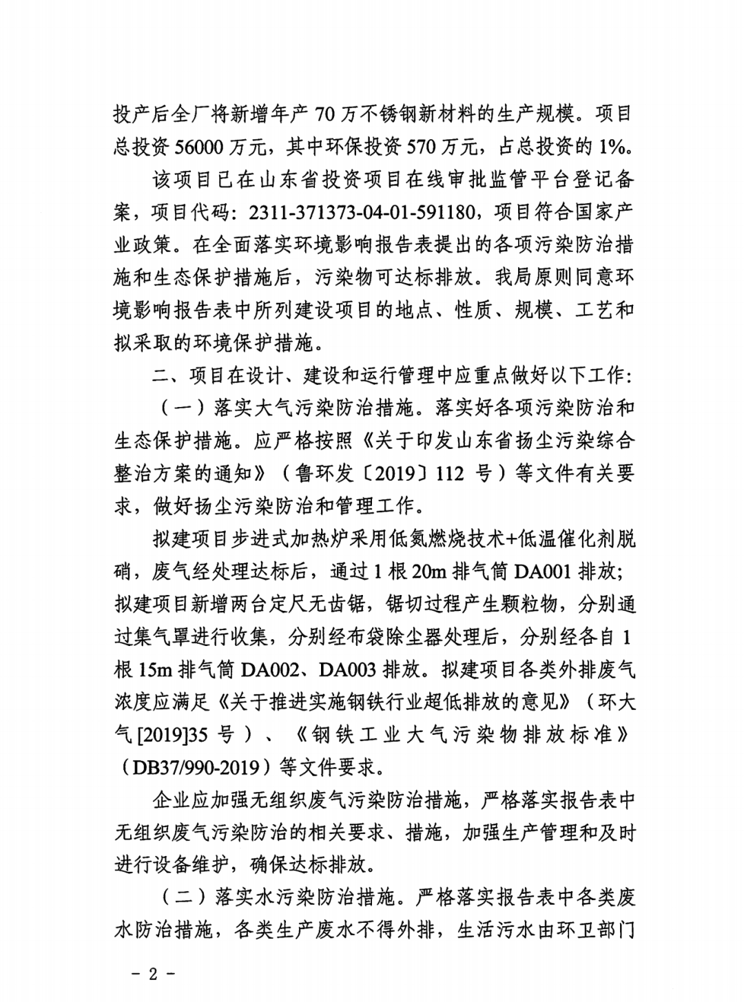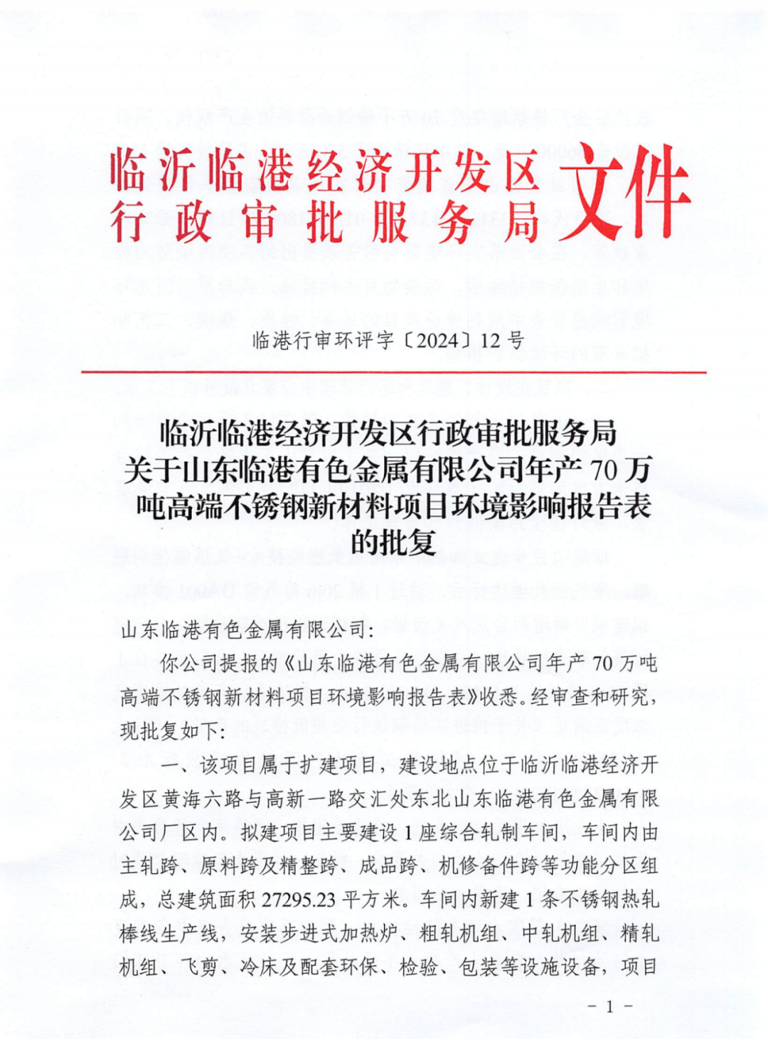 近日山东临港有色金属有限公司年产70万吨高端不锈钢新材料项目环境影响报告已获批。