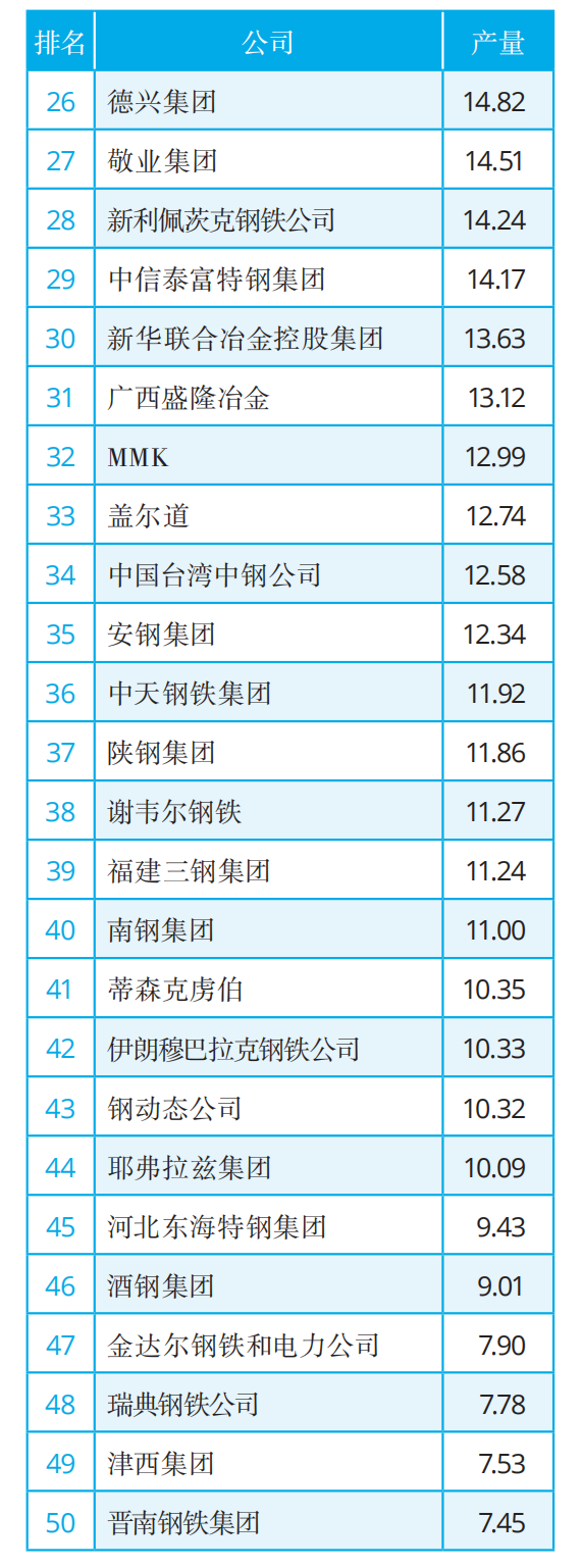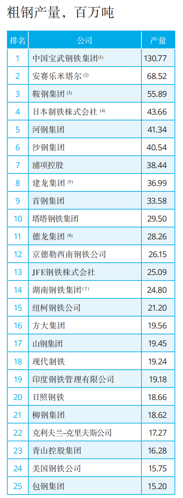 手册公布了2023年全球钢铁企业粗钢产量前50名。其中,中国宝武钢铁集团稳居榜首,安赛乐米塔尔位列第二名,鞍钢集团位列第三名。上榜的中国钢企超过榜单半数,具体排名如下: