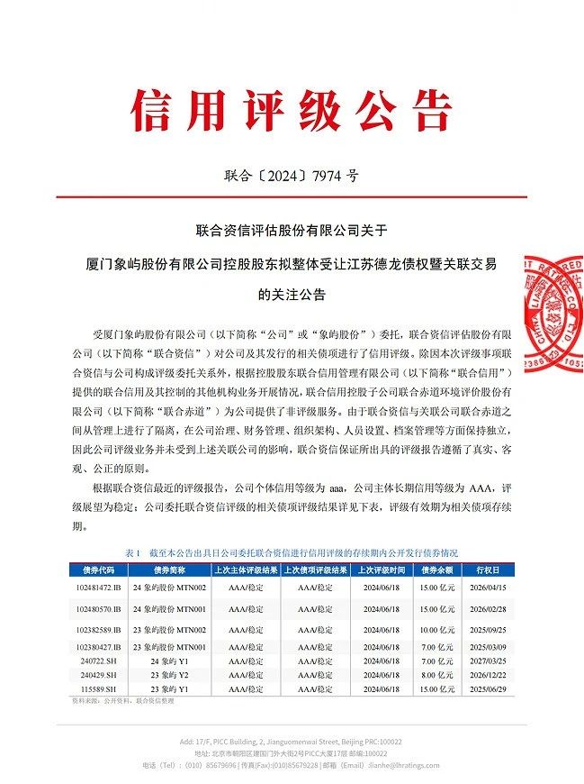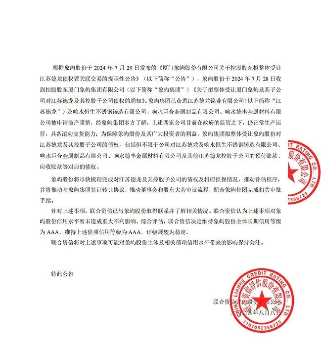 联合资信:关于象屿股份控股股东拟整体受让江苏德龙债权暨关联交易的关注公告