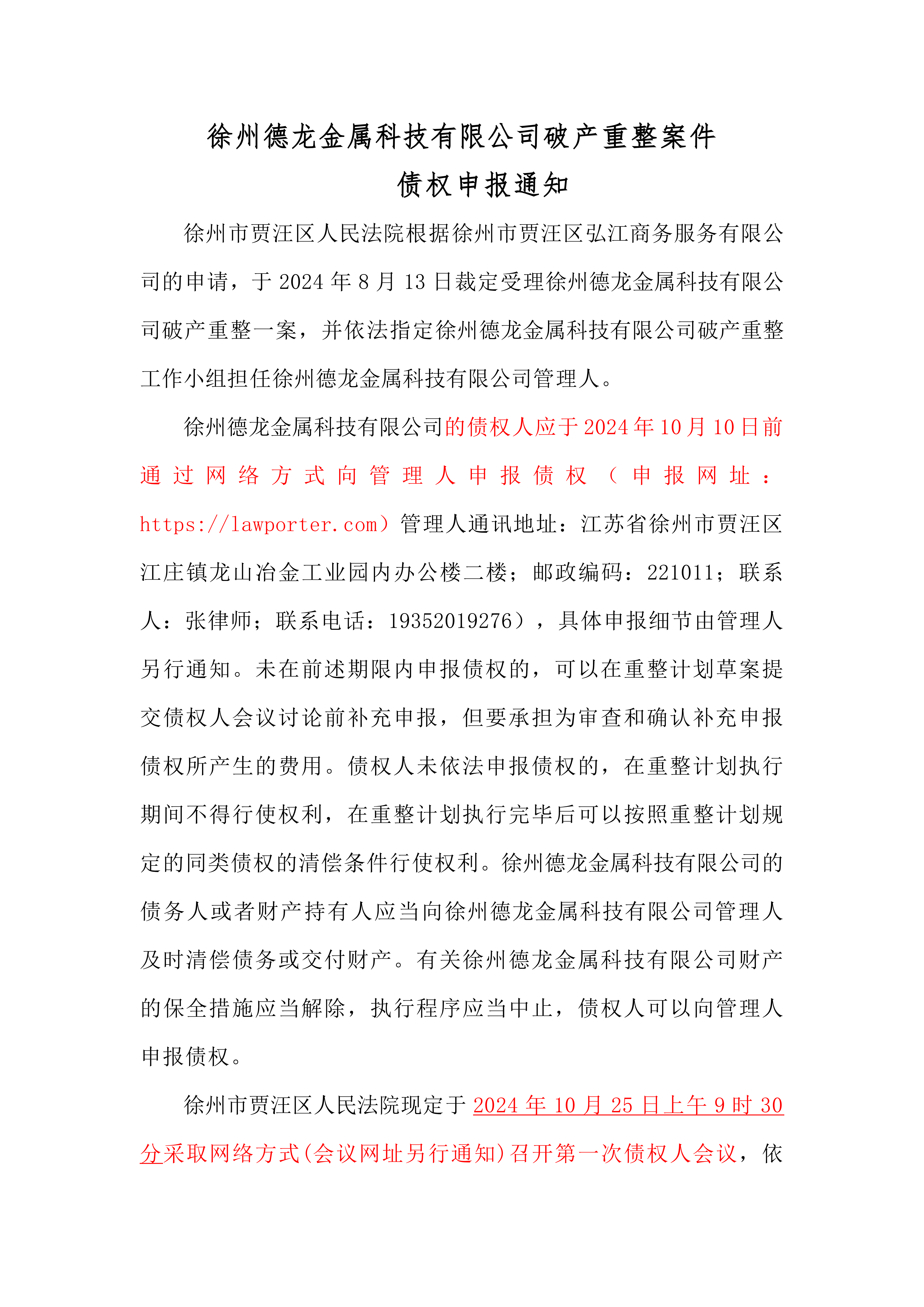 徐州德龙破产重整案件债权申报通知→