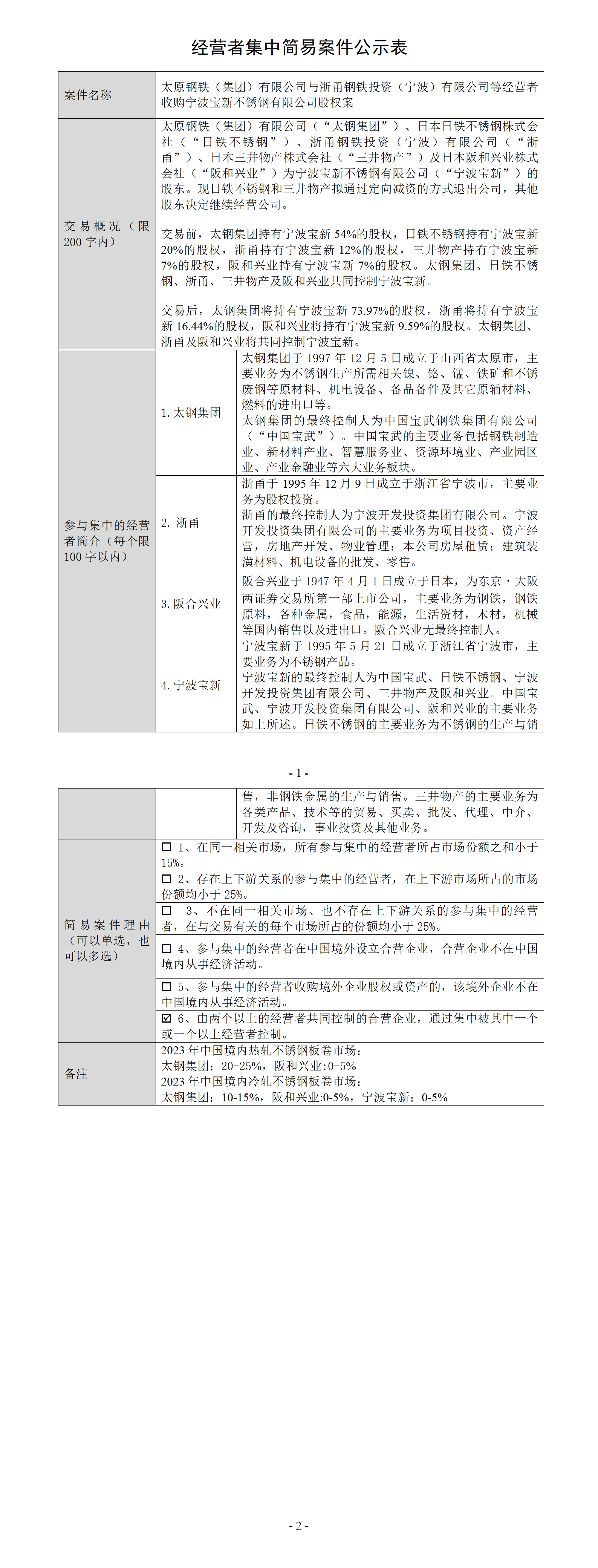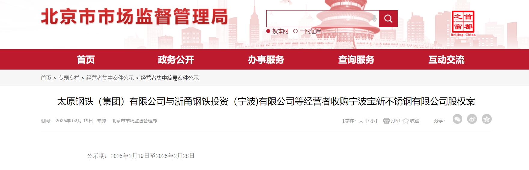 2月19日,北京市市场监督管理局发布公告,太钢集团旗下的宁波宝新不锈钢有限公司(最终控制人为中国宝武)股权结构发生重大调整。日本日铁不锈钢和三井物产两家外资企业通过“定向减资”方式退出公司,其余股东继续持股。太钢集团对宁波宝新的持股比例从54%升至73.97%。
