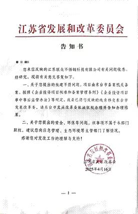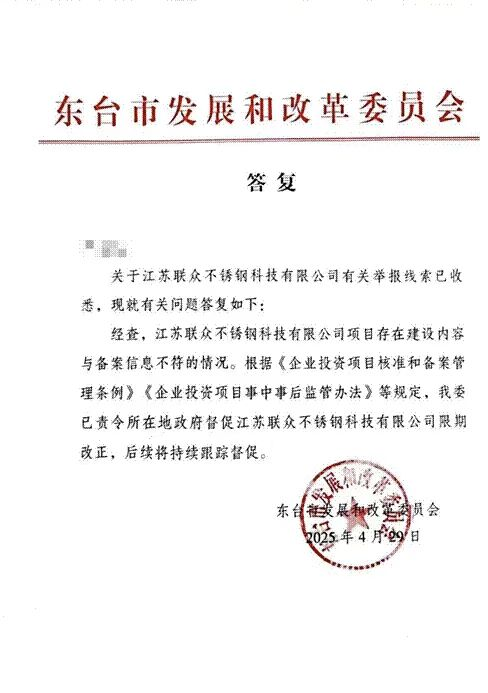 近期,江苏联众不锈钢科技有限公司存在项目批建不符问题,江苏省东台市发展和改革委员会责令所在地政府督促江苏联众不锈钢科技有限公司限期改正。