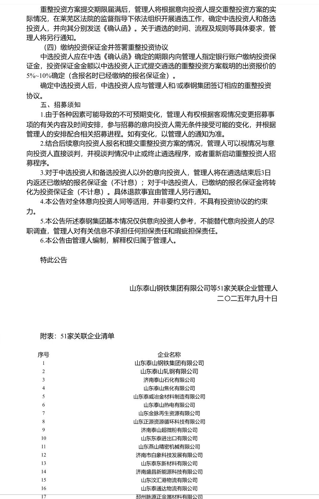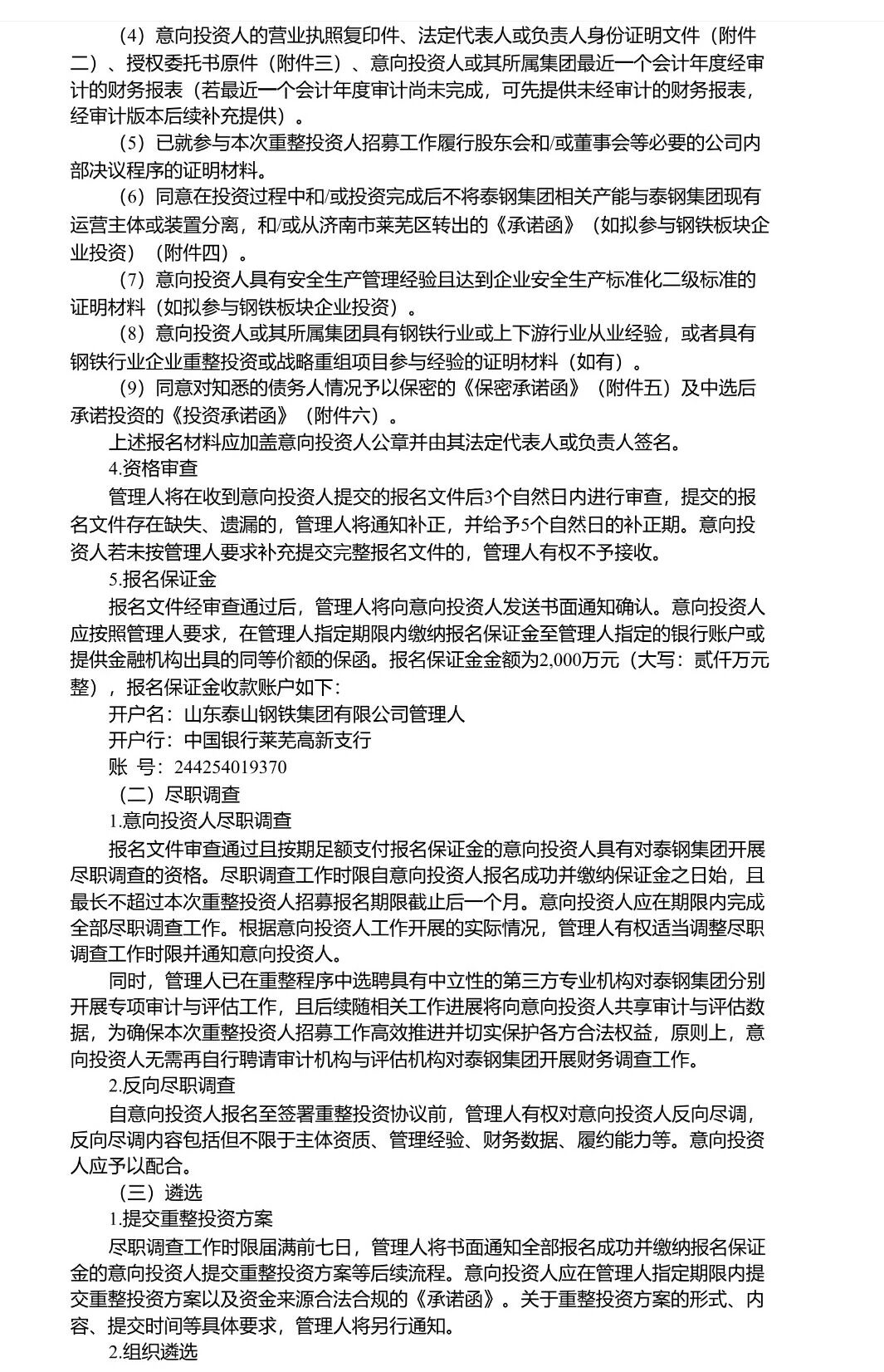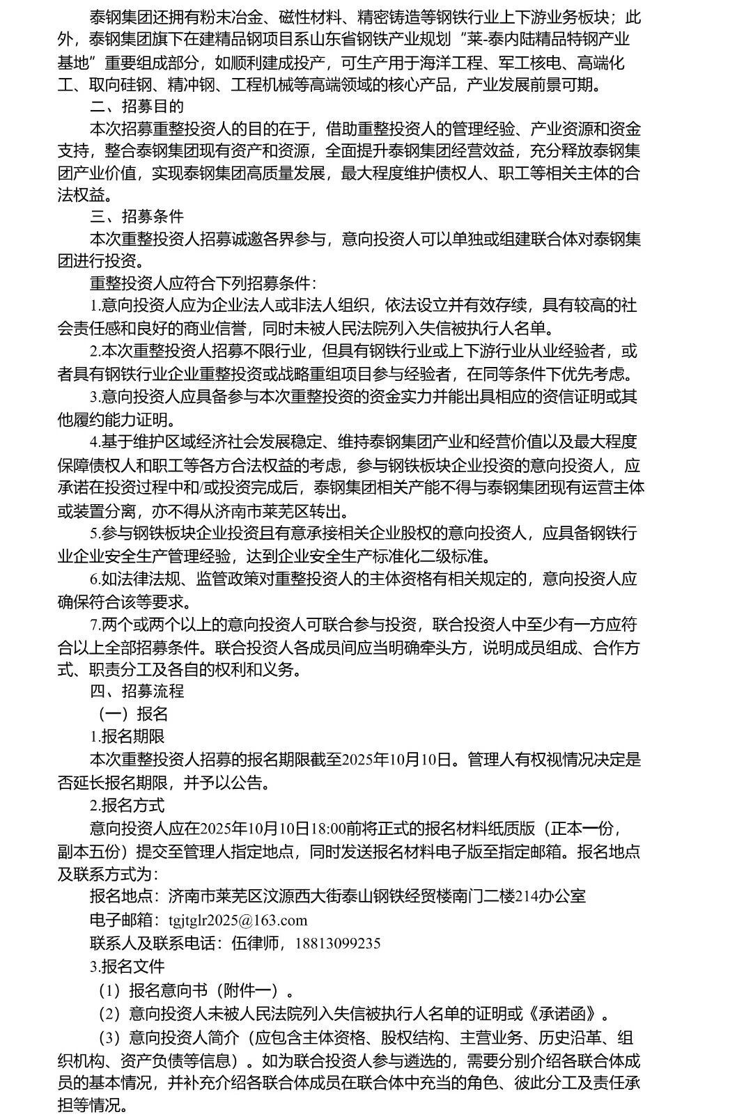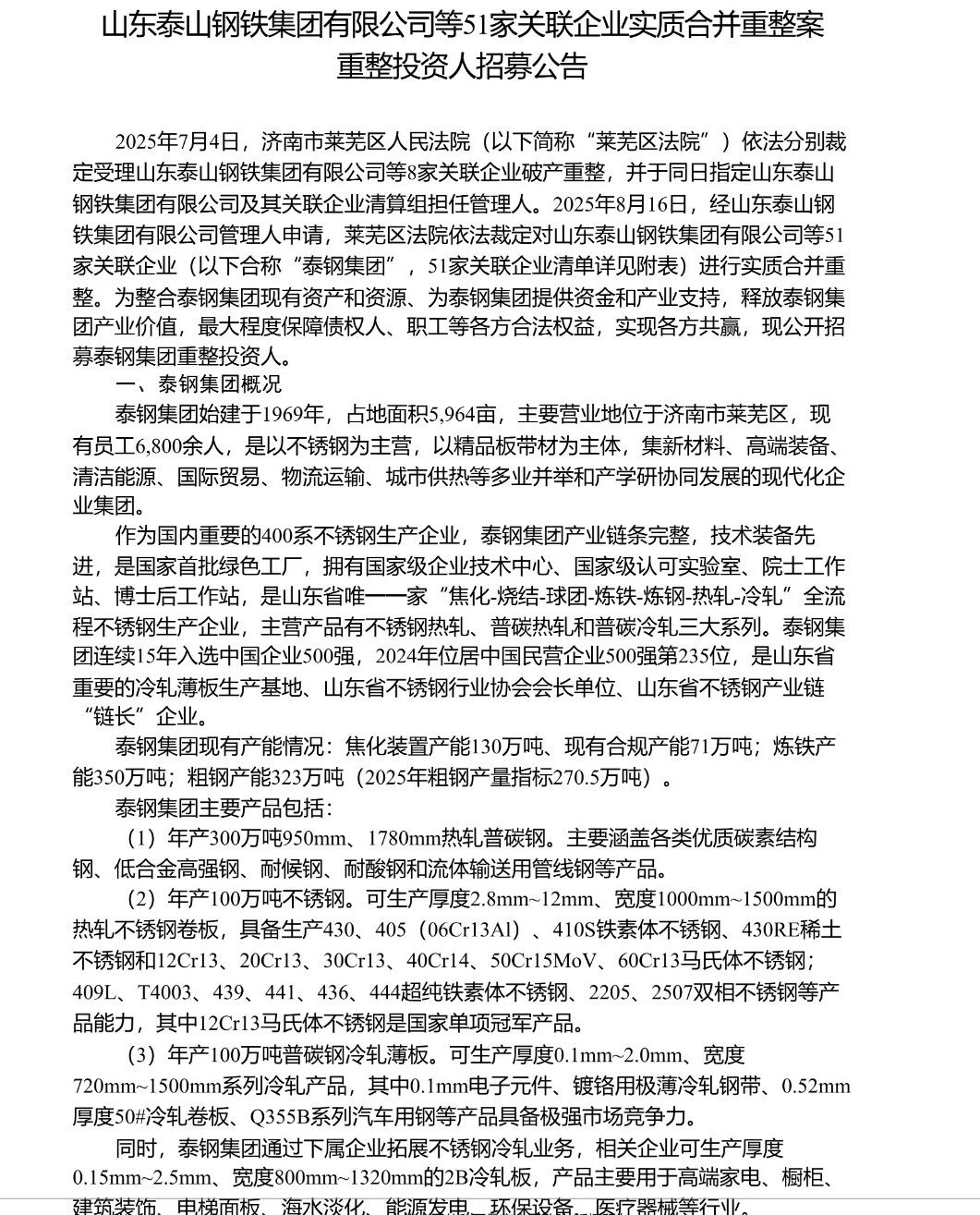 泰山钢铁集团破产重整案新进展:招募投资人→