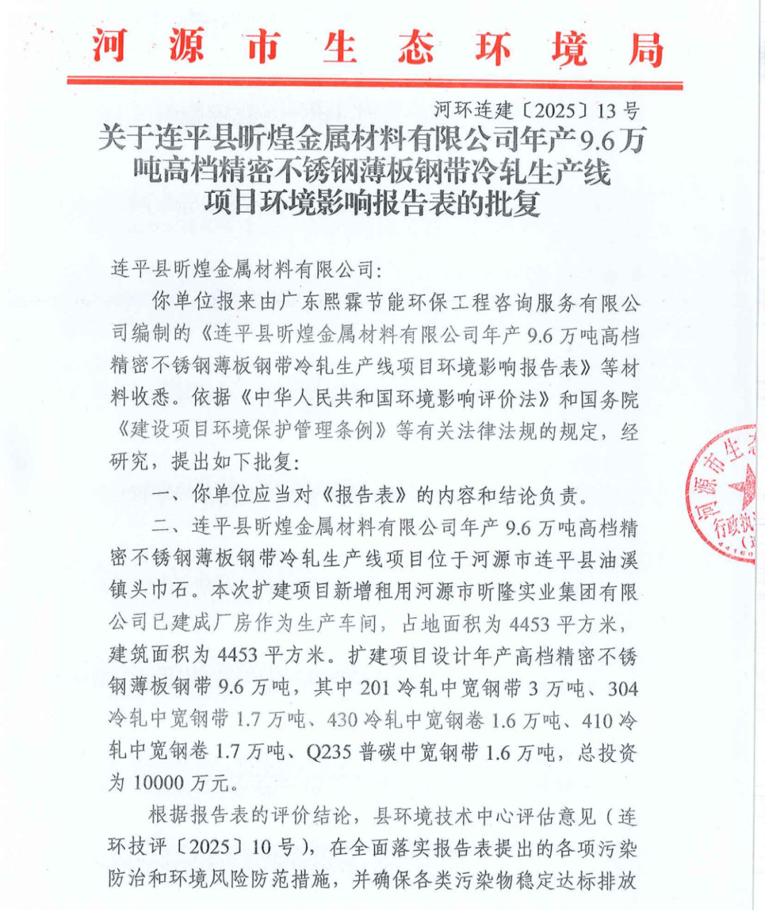 昕煌金属材料年产9.6万吨高档精密不锈钢薄板钢带冷轧生产线项目环评批复