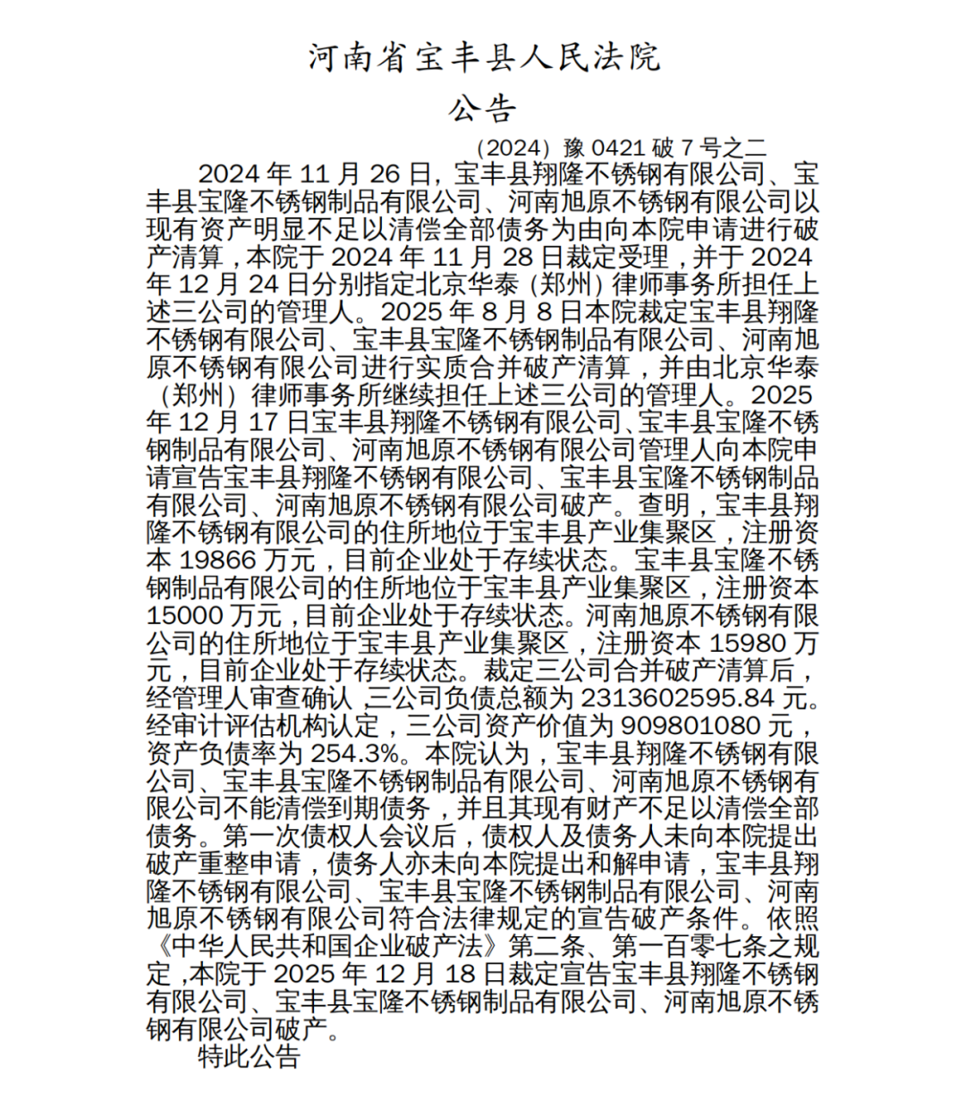 近日,河南省宝丰县人民法院发布宝丰县翔隆不锈钢有限公司、宝丰县宝隆不锈钢制品有限公司、河南旭原不锈钢有限公司三家公司破产公告: