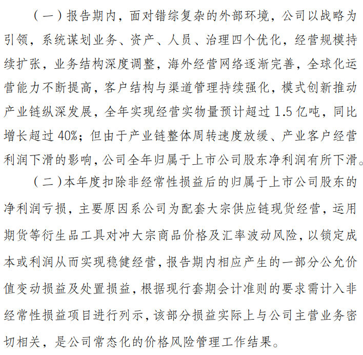 公告称,报告期内,面对错综复杂的外部环境,公司以战略为引领,系统谋划业务,资产,人员,治理四个优化,经营规模持续扩张,业务结构深度调整,海外经营网络逐渐完善,全球化运营能力不断提高,客户结构与渠道管理持续强化,模式创新推动产业链纵深发展,全年实现经营实物量预计超过1.5亿吨,同比增长超过40%;但由于产业链整体周转速度放缓,产业客户经营利润下滑的影响,公司全年归属于上市公司股东净利润有所下滑。